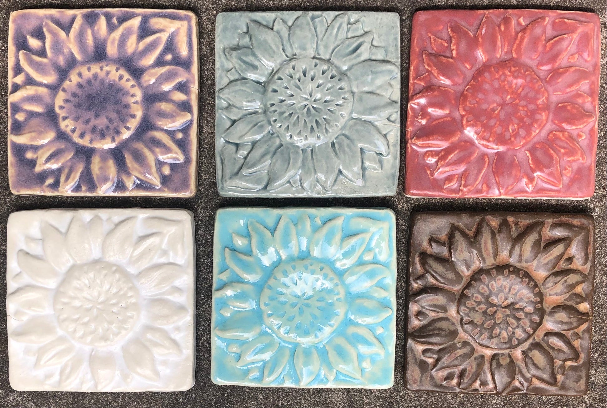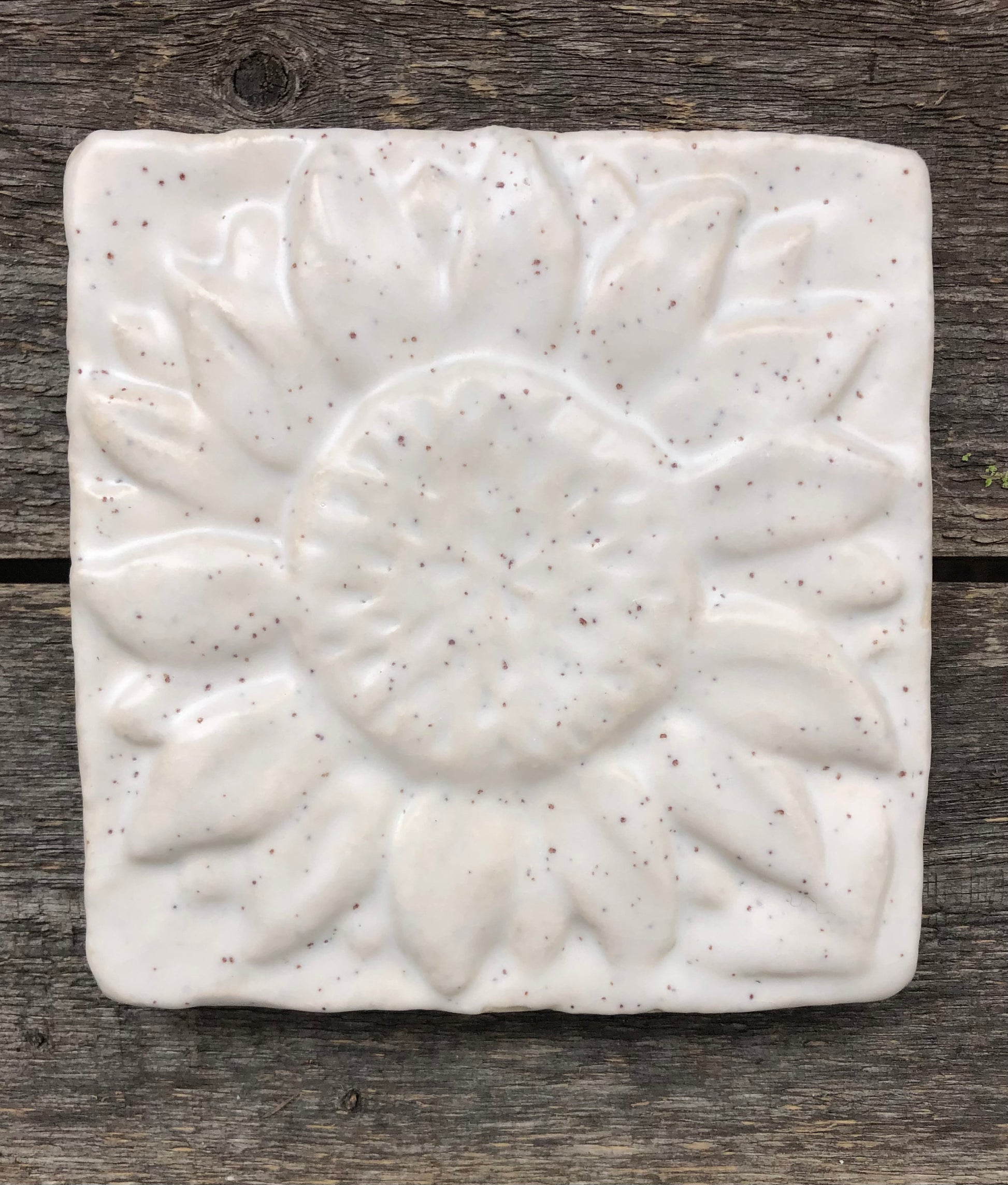 This 4"x 4" sunflower smiles boldly on the viewer, bringing beauty, whimsy and joy to any tile installment. This perennial favorite is pictured in "Morning Glory Gloss", "Caterpillar Green", "Acorn Sheen", "Sandy Shallows White", "White Gloss", "Milk Shake Break" and "Natural". See these colors at work on the "Glazes" page under "Collections". Scroll down and click on different colors to understand better the range of color. Color Samples can be ordered on that page. If you decide a color for this tile it must be noted on THIS page:)